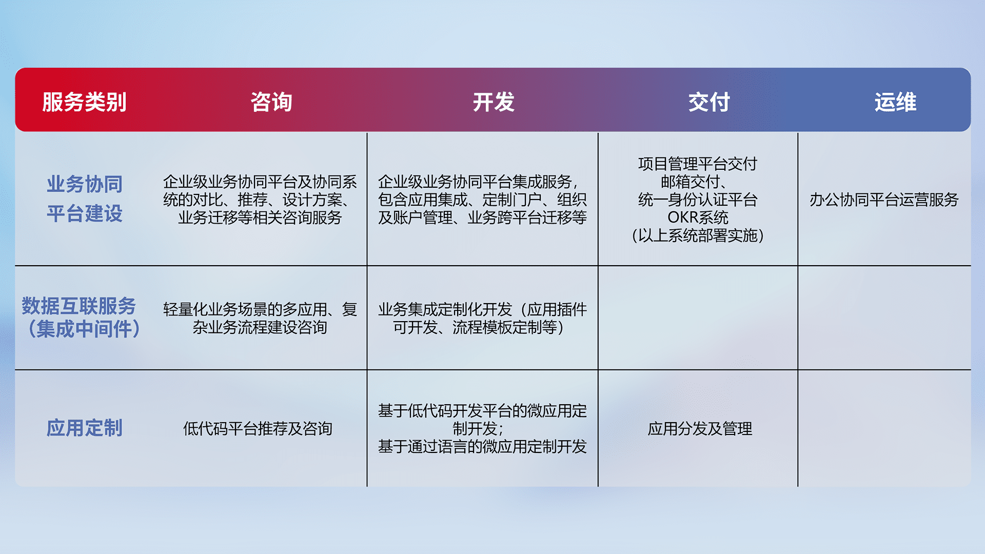 针对钉钉、、、企微、、IDaas等平台级产品提供产品的规划、、、方案、、、交付、、、、定制化开发等服务,,实现如统一协同办公、、、、智能客户服务、、、混合会议管理、、、智能数据查询、、、、等业务场景,,实现数字化转型。。
