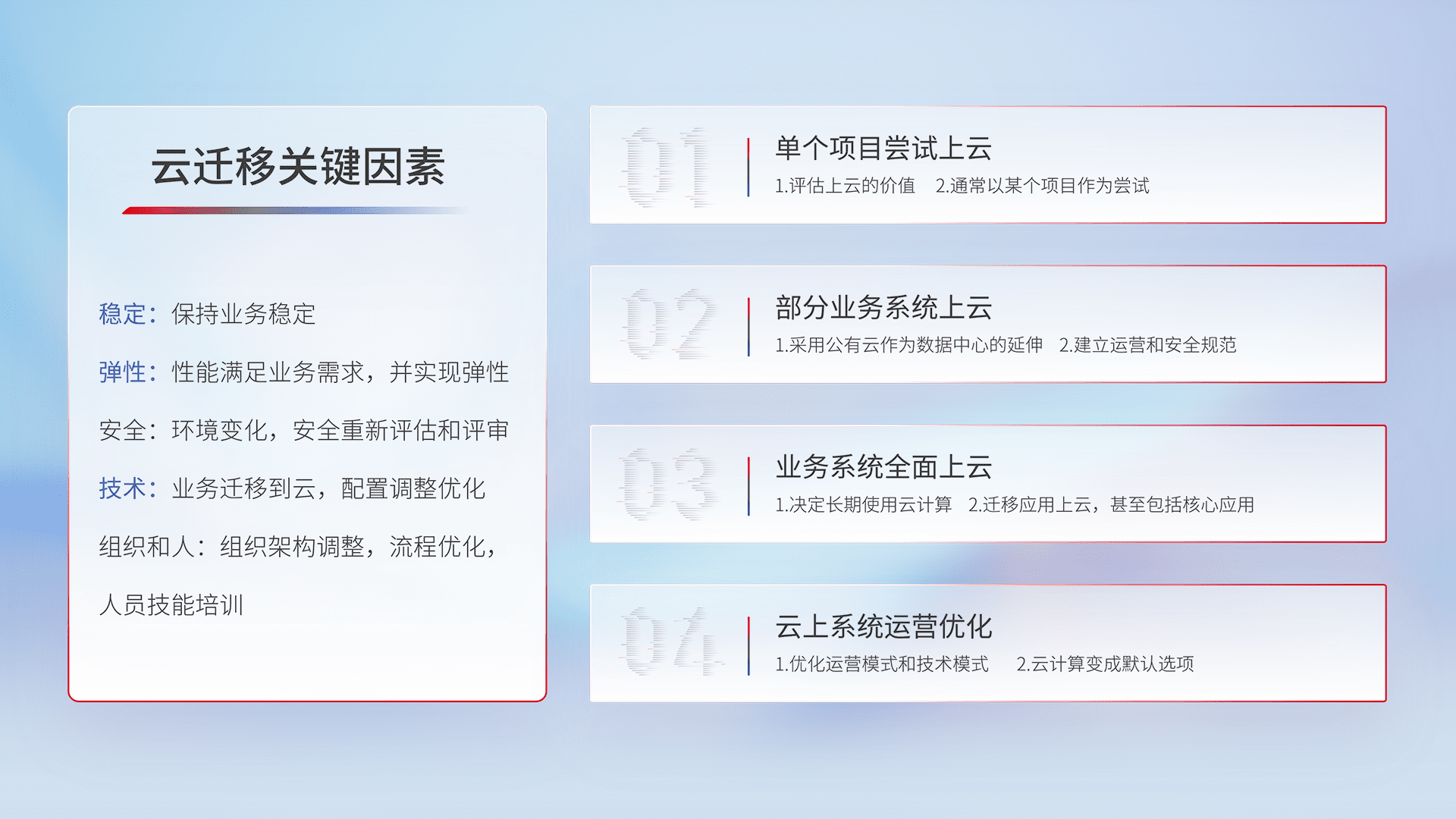 结合实际业务,,,,从规划设计、、云平台选型、、、、云原生改造、、、、数据迁移、、、集成交付,,,,迁移全过程为客户识别最佳上云路径,,做好风险识别管理,,,,设计网络架构、、、身份权限、、、、安全审计合规、、操作审计、、日志审计、、、、监控告警策略、、、多站点容灾设计等,,对云上基础设施进行整体规划,,提升IT治理水平,,以满足弹性、、、、高可用、、、高性能的需求。。。