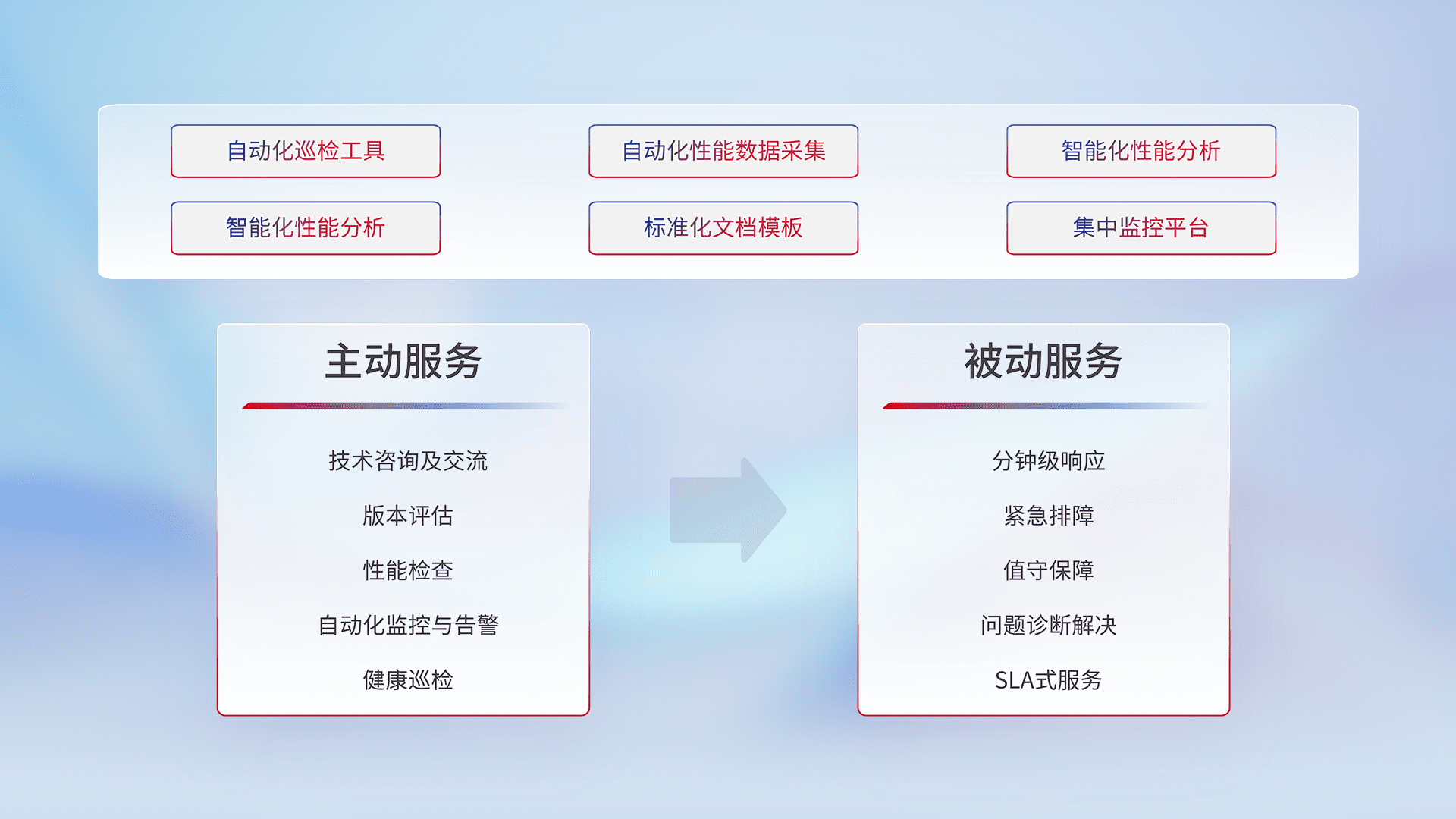 智能化工具和标准化文档,,,,保障服务质量,,提供主动服务(包含技术咨询、、、版本评估、、性能检查、、、、自动化监控与告警、、健康巡检)和被动服务包含(分钟级响应、、、紧急排障、、、、值守保障、、、问题诊断解决、、、SLA服务)。。。。